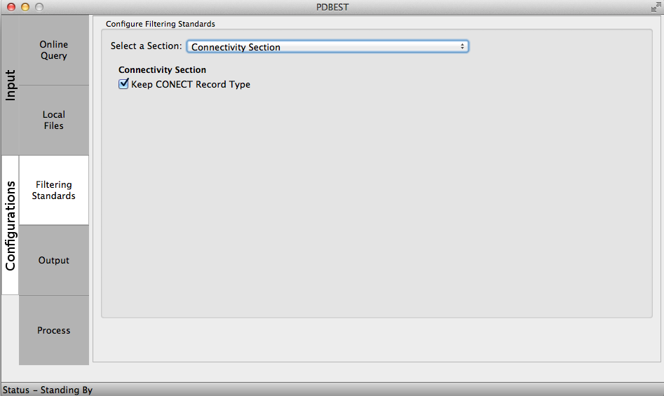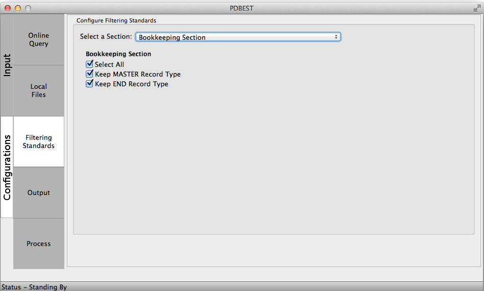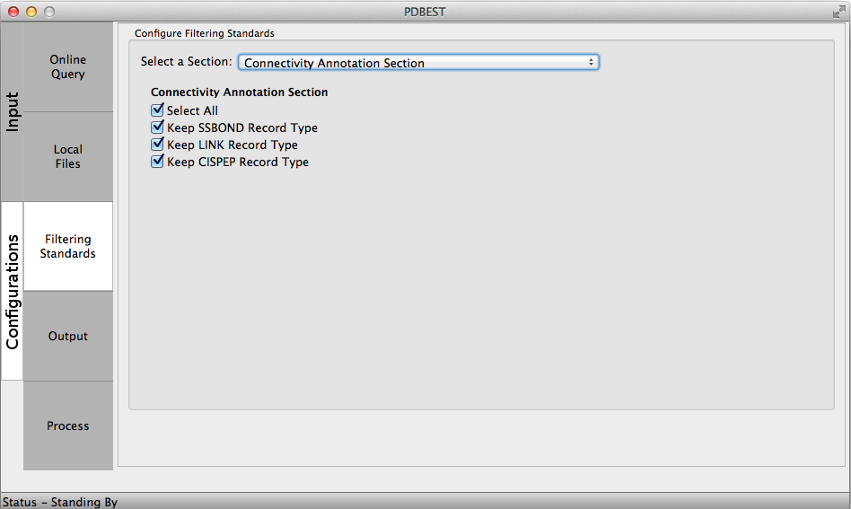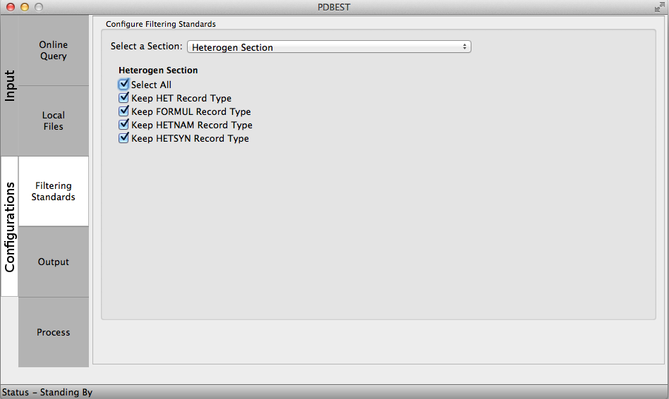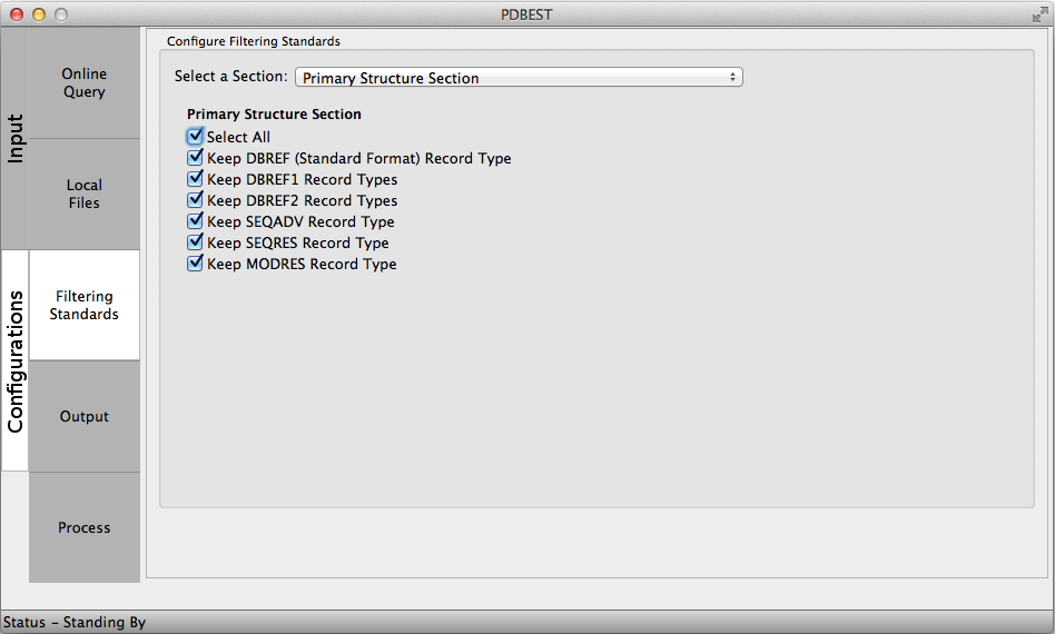 The PDB file format definition stablishes a set of standards to be followed during structure deposition and its sections are extensively described at the wwwPDB. The PDBest filterig criteria is devided in the folloing sections. The user can choose to keep or discard the records selecting the check box accordingly: