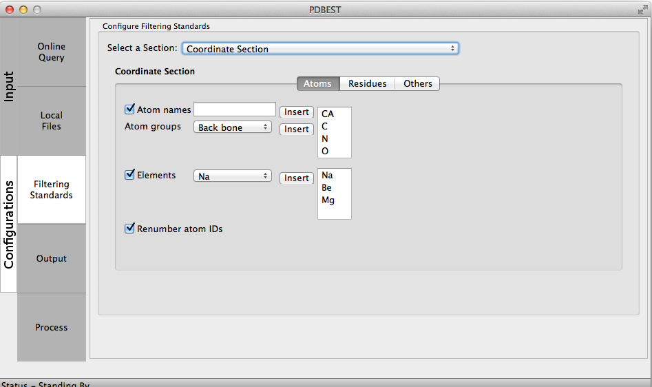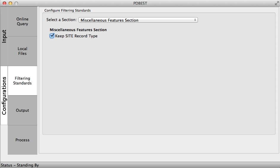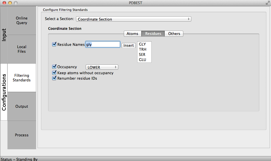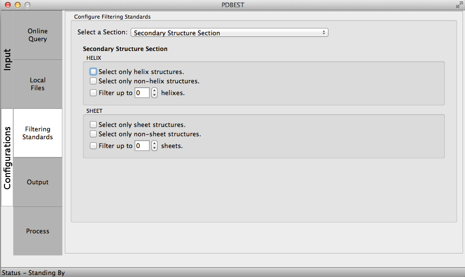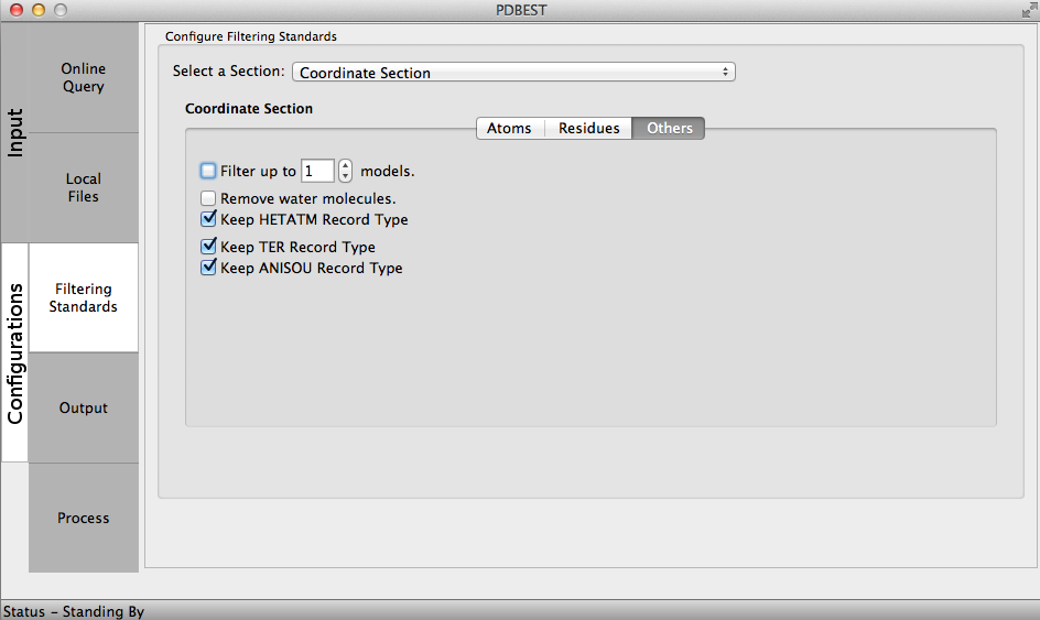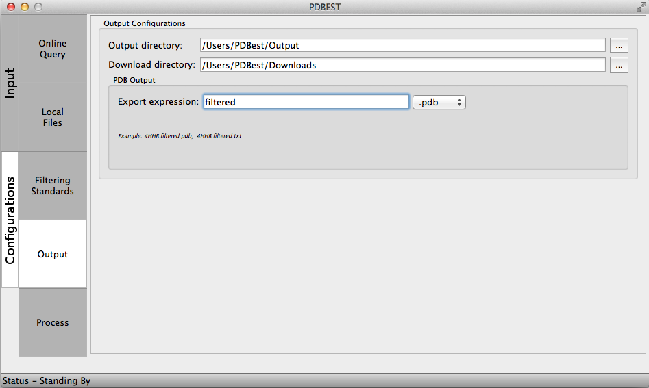 The Output configurations allow users to select the directory where the PDB files will be download from PDB online repository if online queries are performed and where processed files will be stored after the application of filters. The user may include an expression and choose the output format. For example: using the expression ".filtered" every processed file will contain this term as in 4HHB.filtered.pdb.