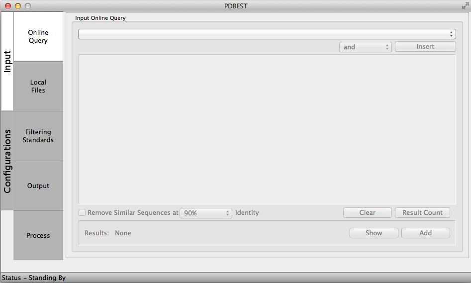 Users can compose their queries via the box menu and add it with the "Insert" button and add or modify its parameters. A query option can be removed using the icon "x" on the window or the the query can be reset with the "clear" button. The "Submit" button will submit the query to the RCSB database and the list of matching PDB files will be shown to be analyses before the processing step. It is possible to change or refine the query before processing, making adjustments at any time. The PDB identifiers can be seen via the "Show" button and a list of them can be saved.