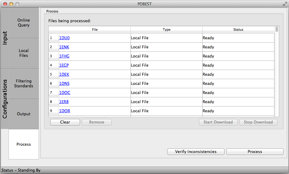 After submiting queries to RCSB Protein Data Bank and/or loading local files and choosing filtering criteria, the files can be seen on a grid on the Process section. Up to a hundred file indentifiers can be seen at once. On the grid the origin of the file (online/local) and its status (to be downloaded/ready) is shown. The files with "To be downloaded" status will be downloaded by pressing the "Start Download" button.